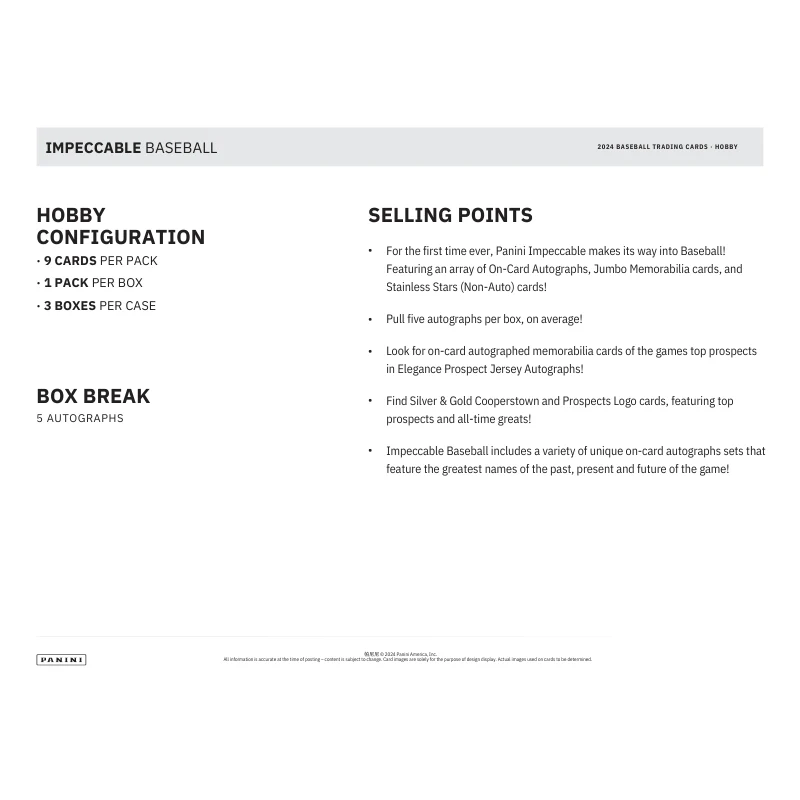 - For the first time ever, Panini Impeccable makes its way into Baseball! Featuring an array of On-Card Autographs, Jumbo Memorabilia cards, and Stainless Stars (Non-Auto) cards!